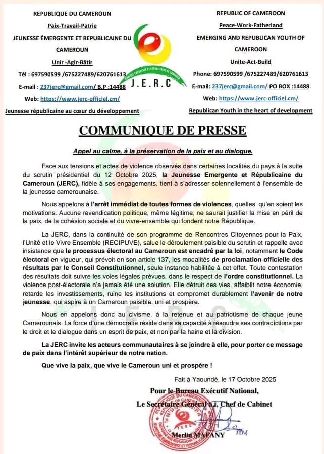 Message de la Jeunesse Émergente et Républicaine du Cameroun