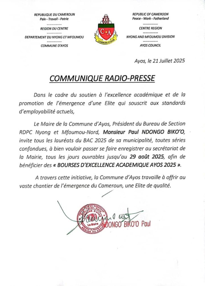 En effet dans le cadre du soutien à l’excellence académique et la promotion de l’émergence d’une élite qui souscrit aux standards d’employabilité actuel, le Maire de la commune d’Ayos, Président du bureau de section RDPC Nyong et Mfoumou-Nord, le premier magistrat de la ville Paul Ndongo Biko’o invite tous les lauréats du BAC 2025 de sa municipalité, toutes séries confondues, à bien vouloir passer se faire enregistrer au secrétariat de la mairie, tous les jours ouvrables jusqu’àu 29 août 2025 afin de bénéficier des » Bourses d’excellences académique Ayos 2025″