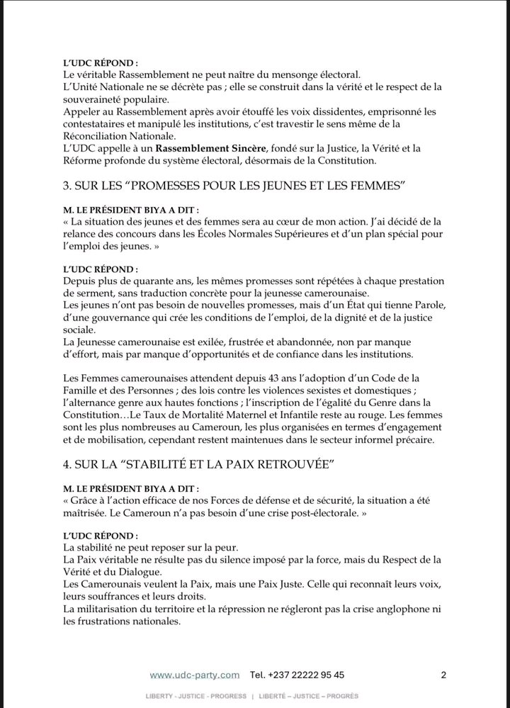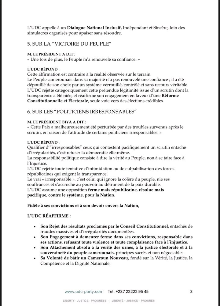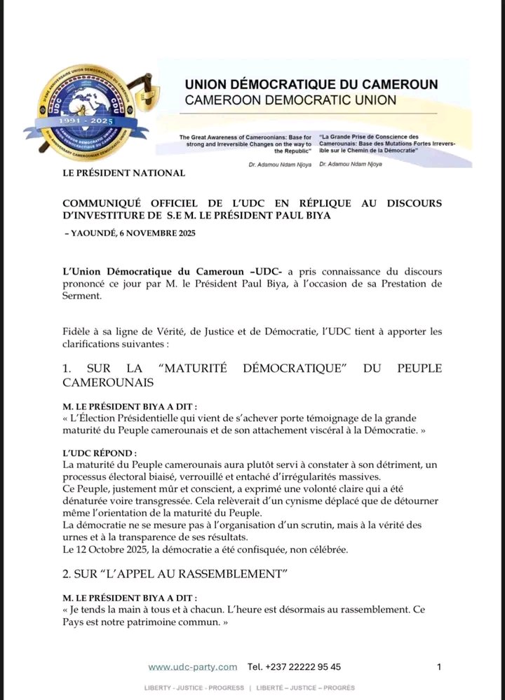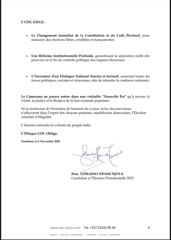 ‹‹ Honorable Mme le Maire, chère Tomaïno, je tiens à vous féliciter pour votre résultat respectable aux elections présidentoelles. Je tiens également à saluer votre courage. Toutefois, en votre qualité de femme politique engagée et ardente défenseur de la démocratie camerounaise, votre communiqué du 6 novembre 2025 fait résonner avec force la voix aimante d’une opposition veillant sur la vérité et la justice. Cependant, permettez-moi, avec tout le respect dû à votre rang et à votre parcours, d’attirer votre attention sur quelques considérations essentielles, dictées tant par le droit que par l’esprit républicain qui guide notre Nation. Dès lors que S.E. Monsieur le Président, dûment élu selon la Constitution et les lois en vigueur au Cameroun, a prêté serment, il devient à juste titre le Président de tous les Camerounais, sans distinction ni exclusion. Cette solennité scelle sa légitimité et impose à chaque citoyen, y compris à ceux qui s’opposent à sa politique, le respect dû à la fonction qu’il incarne. C’est une règle fondamentale que la République ne peut flétrir, si l’on veut préserver l’ordre démocratique et la paix sociale. En outre, il convient de rappeler, conformément à l’article 138 du Code de procédure civile camerounais, que la charge de la preuve pèse sur la partie qui allègue des faits. À ce titre, les accusations que vous formulez au sujet d’irrégularités électorales et de fraudes massives appellent à produire des preuves tangibles, dûment constatées et juridiquement recevables. Or, à notre connaissance, aucun constat d’huissier manifestant ces prétendues anomalies n’a été communiqué, ce qui fragilise la portée de vos allégations. Par ailleurs, votre recours devant le conseil constitutionnel a fait état d’une imputation fondée sur les textes législatifs relatifs aux élections sénatoriales, non à ceux régissant les élections présidentielles, dont la nature, les règles et les procédures diffèrent strictement. Cette confusion, regrettable, a affaibli la validité même de votre contestation portée. J’étais présente dans la salle ma soeur. La vertu de la République commande que tout litige électoral soit exercé dans le cadre rigoureux et loyal des procédures prévues, sans quoi le débat démocratique se mue en querelle vaine. Ainsi, tout en respectant votre engagement noble et ferme, il importe que vos récriminations s’inscrivent dans une démarche juridique rigoureuse et prouvée, pour que la Nation tout entière puisse avancer, réconciliée et unie. Hon Dr Me Fostine Chebou Fotso ››.