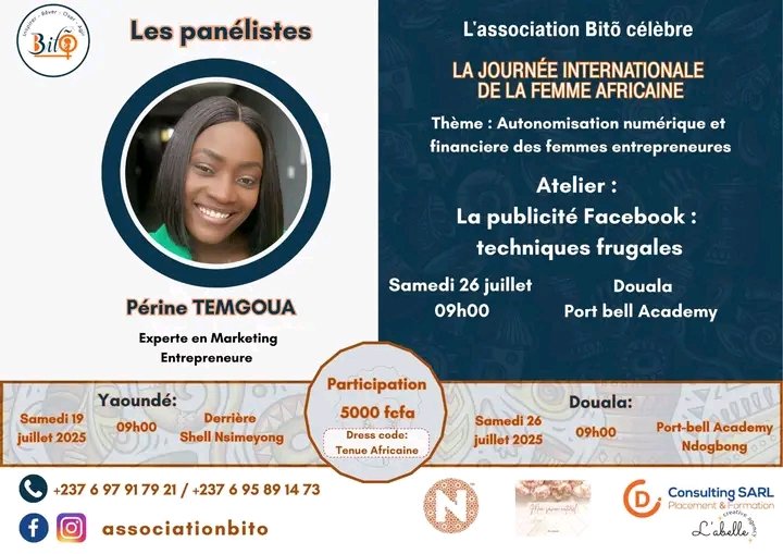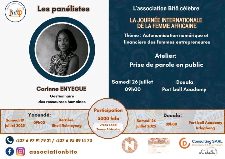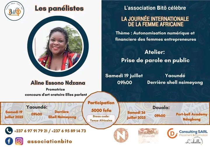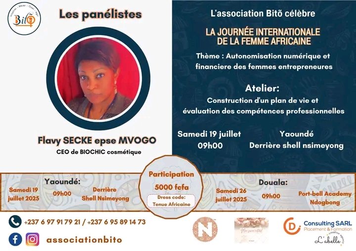 À l’occasion de la célébration de la journée internationale de la femme africaine, l’association BITO convie les femmes entrepreneurs, professionnelle et innovantes, le samedi 19 juillet 2026 derrière la Shell Nsimeyong à Yaoundé à partir de 9h.