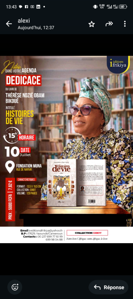 Le jeudi 10 juillet 2025, dans les locaux la Fondation Muna, s’est déroulée la cérémonie de dédicace de l’ouvrage de Thérèse Ndzié Obam Bikoué, intitulé Histoires de vie, publié dans les éditions Ifrikiya. Cette conférence dédicace rassemblé un grand nombre de personnalités très attentif et admiratifs venu saluer une œuvre de l’esprit de Dame Bikoué dans le sillage de l’oralité, entre réminiscence affective et legs symbolique. Cet assemblage de contes, est l’origine d’une maturité d’esprit s’inscrivant dans la continuité d’un art de dire où chaque mot devient éclat de mémoire.