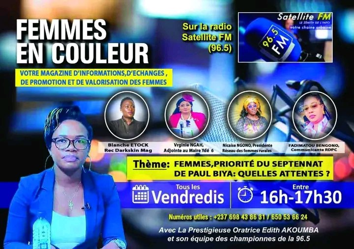 Présentée par Edith Akoumba, Femmes en couleur est une émission hebdomadaire qui passe chaque jour vendredi entre 16h et 17h30 sur Satellite FM. Une radio appartenant au Groupe l’Anecdote.